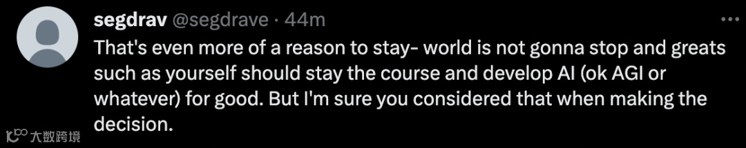 这更应该是你留下来的理由。因为世界是不会停止的,像你这样的伟大人物应该坚持下去,并将人工智能发展的更好。