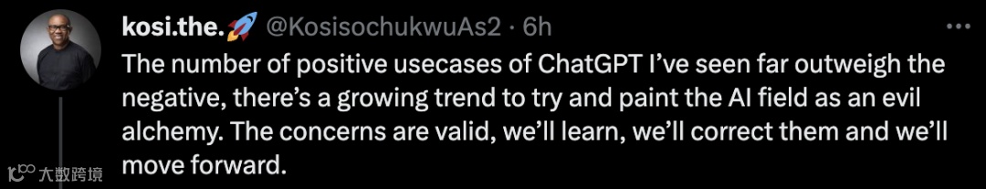 我见过的ChatGPT积极应用案例远多于消极的,但现在的趋势是把AI描绘成邪恶的炼金术。这些担忧是合理的,我们会学习,我们会纠正它,然后我们会继续前进。