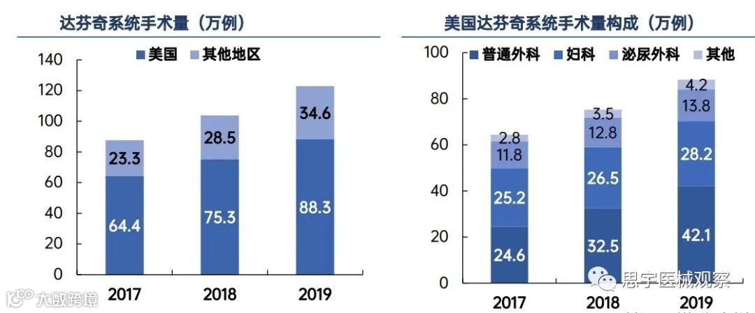 纵使新的医疗及手术机器人在火速地迭代更新,目前看来,达芬奇手术机器人仍旧是全球应用最广泛的手术机器人。目前全球达芬奇手术量达到600万例。去年一年,全球的手术量突破100万例,其中,国内达到3.26万例。