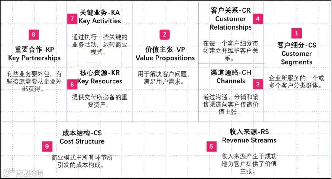 商业模式画布来自是一种能够帮助团队催生创意、降低猜测,确保他们找对了目标用户、合理解决问题的工具。商业画布利用可视化的方式帮助团队成员达成共识,便于团队成员用统一语言讨论。整个画布基于“为谁提供,提供什么,如何提供,和如何赚钱”四个视角考虑,由九大模块组成,它们之间相互关联,互相影响。