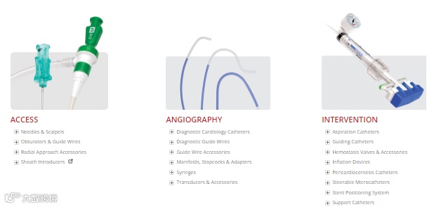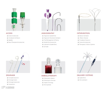 (一)外周干预产品:用于诊断和治疗除心脏外的外周血管和器官疾病,产品组合包括:通路,血管造影,干预,活检,引流和解决方案。