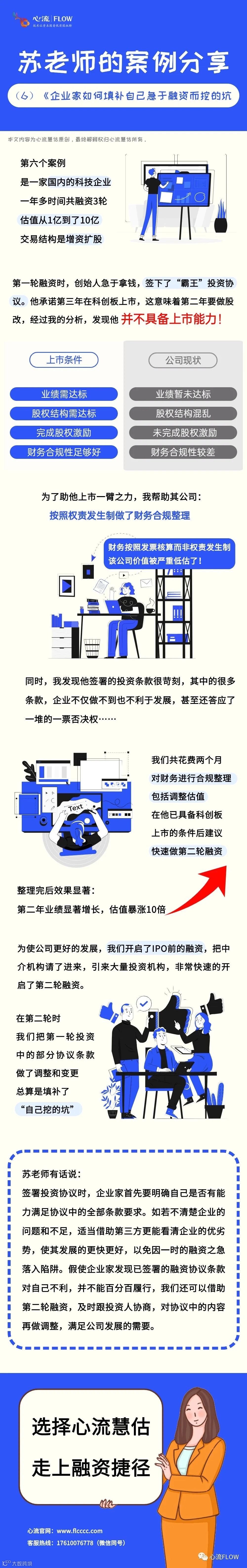 这是一家国内著名的科技企业,一年多时间融资了3轮,估值翻了10倍。第一轮融资时,公司发展艰难,创始人急于拿钱,签下的协议对自己非常不利,他承诺了第三年在科创板上市,实际上根本做不到……情急之下,他找到了苏老师,帮助其分析公司整体情况,做合理规划,还调整了估值。最终不仅快速开启了第二轮融资,还填补上了前一轮融资时创始人自己挖下的坑,你知道苏老师是如何做到的吗?快下滑翻翻看吧!