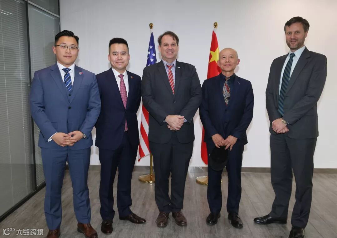 ▲(从左向右)总经理 Jason Sun 副董事长George Liang 总领事Sean Stein 董事长Charles Liang 领事馆外联处长Jeremy Beck