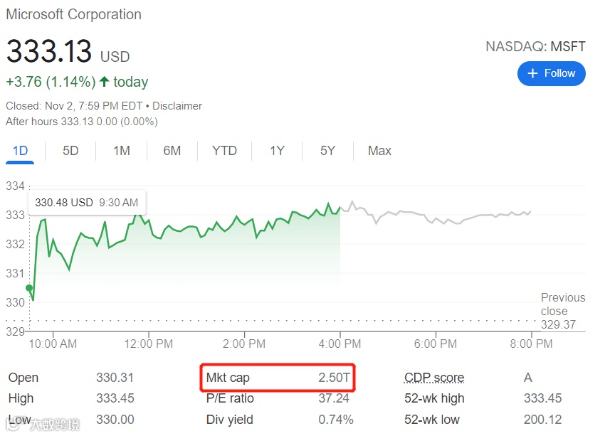 周二收盘,微软股价攀升1.14%,每股报价333.13美元,公司市值突破2.5万亿美元,超越苹果,成为全球上市公司市值一哥!