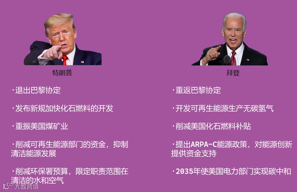 接任总统第一天,拜登便火速提交巴黎协定“入群申请”,承诺在2050年实现“碳中和”。同时宣布一项2万亿美元的绿色复苏计划,促进绿氢产业化,以及“使用联邦政府的采购系统,实现百分百能源清洁和车辆零排放”。