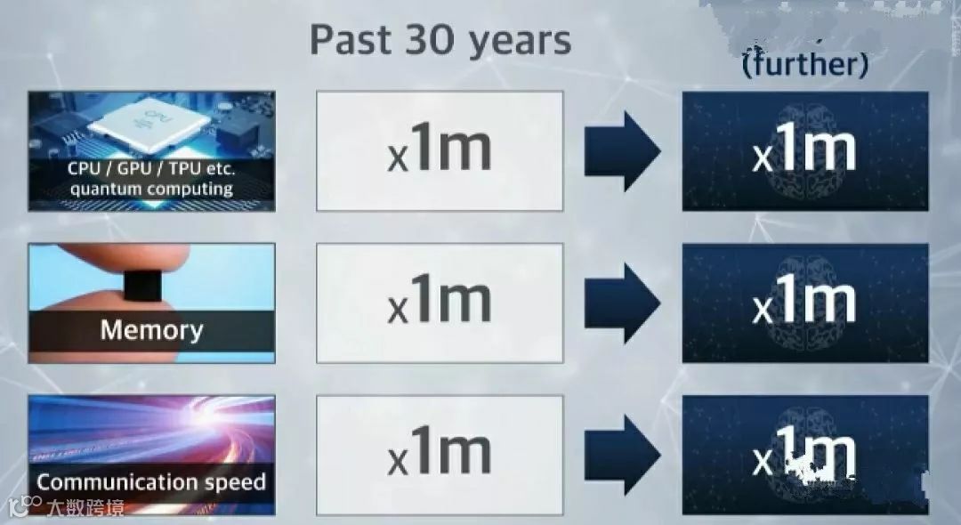 各位,处理器的运算能力,记忆体的储存能力,互联网的传输能力,在这30年来,都成长了100万倍。30年来,成长的幅度是这样,那再过30年呢?