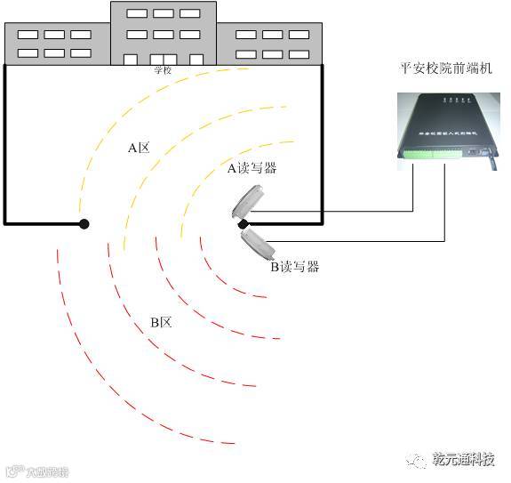 工作原理:每个学生身上携带一张远距离标签卡,每张卡号是唯一的,也是每个学生的身份标识。校门口装有读卡器,学生出入校门时,卡无需取出,读卡器自动读卡,并将卡号传至前端机。前端机对卡号做出入状态的判别,完成后将数据上传至平安校园服务系统软件。系统即可实现学生合法身份识别,学生进或出校门记录 。
