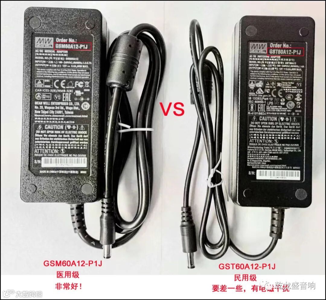 随后我们采购了10几种适配器回来对比,最终胜出的仍然是明纬这个品牌,只是胜出的已经不再是民用级产品,它是明纬医用级的GSM60A12-P1J。我不得不说医用级的质量非常的高,漏电变得很小,电磁干扰也变得很小。我们通过一种特定的方法采集出来的干扰值小于30uV,而原来的GST60A12-P1J用同样的方法采集到的干扰是3mV。进一步通过声音的试听对比,我们也发现GSM在工作时已经对周围器材完全没了任何可闻的干扰。