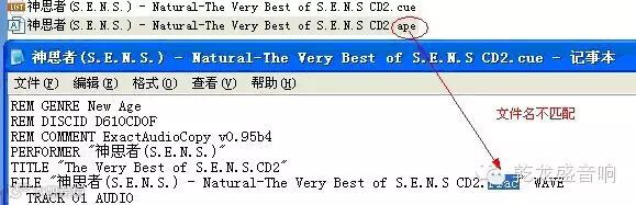 (1). 网上下载的很多歌曲都是一些发烧友自己买的CD抓轨的, 一开始用EAC抓轨出来的是wav, 后来上传到网络时因为网速关系, 他压缩成ape, 但是, CUE文件里边的”FILE”参数的歌曲名后缀仍然没有修改成ape, 仍是wav, 这样的CUE就不能播放, 需要手动修改后缀进行匹配. 如下图就是CUE的FILE参数的后缀是flac, 整轨文件后缀是ape, 所以CUE不能播放.