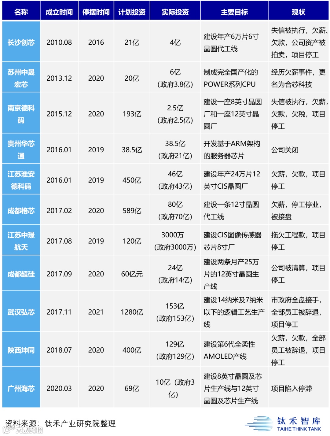 弘芯并非孤例。2019-2020短短一年多时间里,我国江苏、四川、湖北、贵州、陕西5省的6个百亿级半导体大项目先后停摆,总规划投资规模达2974亿元。