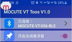 第一步,开启MOCUTE工具悬浮窗:将游戏手柄开机后,手机连接MOCUTE-VT-BLE的蓝牙名,然后打开MOCUTE工具,再开启悬浮窗,如下图所示: