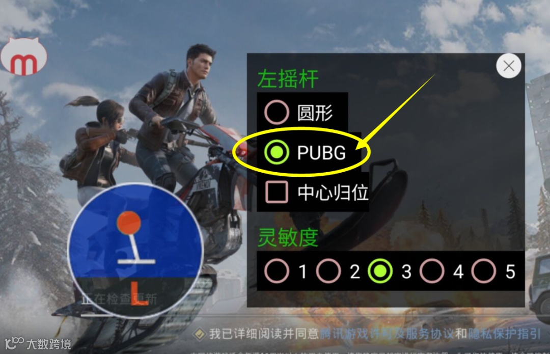 说明:1.《和平精英》中需要将左摇杆设置为PUBG模式,才能实现摇杆向前时奔跑,双击左摇杆图标,选中【PUBG】选项即可。如下图所示: