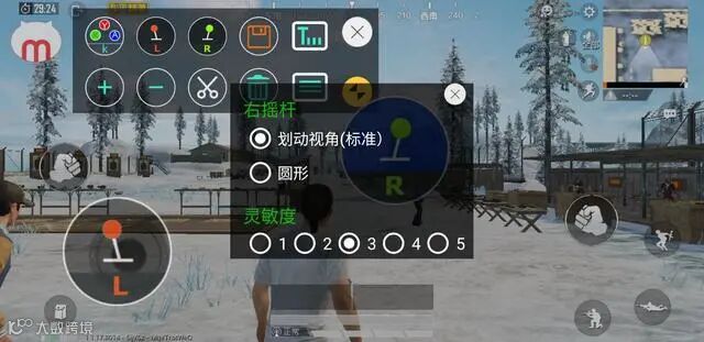2.《和平精英》中转动视角方向设置方法:双击右摇杆R图标,在属性中设置【划动视角】(默认为【划动视角】属性,【圆形】属性不太常用,可以于小地图,以及《魂斗锣.归来》中360度方向射击等),右摇杆可以调整5级视角灵敏度。