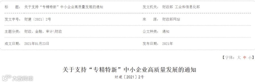2021年1月23日,财政部、工业和信息化部联合印发《关于支持“专精特新”中小企业高质量发展的通知》,启动中央财政支持“专精特新”中小企业高质量发展政策。为让企业对申报相关事宜有更深入的了解,现对各地申报认定“专精特新”政策进行汇总。