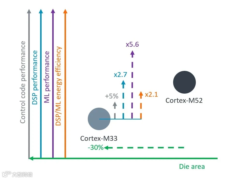 全新 Cortex-M52 带来了更高的能效表现,是替代此前基于 Cortex-M3 和 Cortex-M33 的主流 MCU 的绝佳之选。Cortex-M52 的 ML 性能提升了多达 5.6 倍,DSP 性能则提升了多达 2.7 倍。为了满足各种系统的需求,Cortex-M52 还提供更出色的标量性能和先进的内存接口。