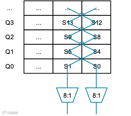 MVE 重复使用浮点寄存器文件,因此矢量寄存器(Q0 至 Q7)由每四个一组的若干组 “S” 寄存器组成。每个列多路复用器选择相同的行,然后将数据合并以访问整个 Q 寄存器(见上图)。但是,如果不能从一列中的任何寄存器中选择,而是将端口扭曲,从交替列中的寄存器中选择,如下图所示,会如何呢: