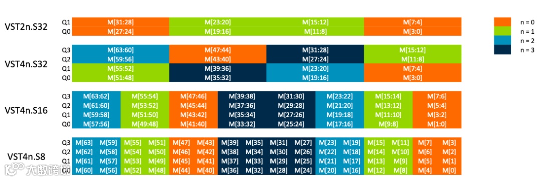下图显示了由读取端口扭曲模式衍生出的一些指令访问模式。第一种情况 (VST2n.S32) 显示从矢量寄存器 Q0 和 Q1 读取 32 位 (S32),并将其两路交织(如左右音频通道)。图中颜色代表两条指令分别读取的寄存器部分(即 VST20 读取橙色部分),元素中的文字表示内存中存储的字节偏移。