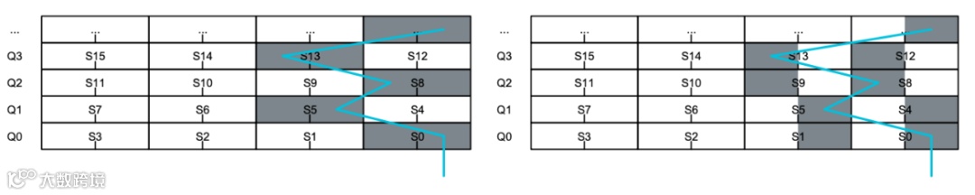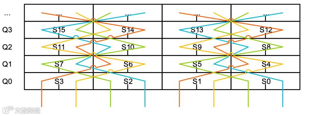 为了让大家看到嵌套的螺旋线,我在下图中标注了单个多路复用器的路径。如图所示,路径每行交替通过 32 位 “S” 寄存器(如左图所示),每两行交换通过 “S” 寄存器上下两半 16 位区域(如右图所示)。