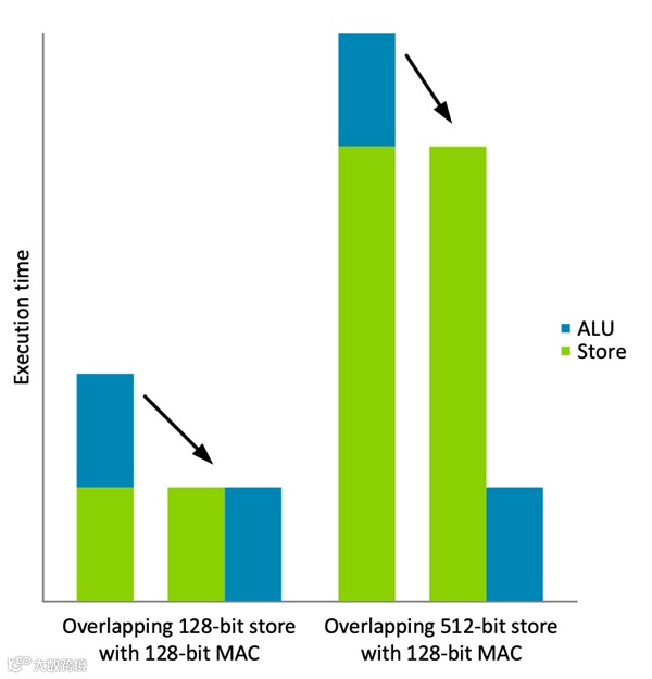 MVE 的“节拍式”执行的主要优点之一,是它允许内存和 ALU 运算重叠,即使在单发射处理器上也是如此。如下图所示,基于此技术要实现性能的翻倍,所有指令必须执行相同的工作量。