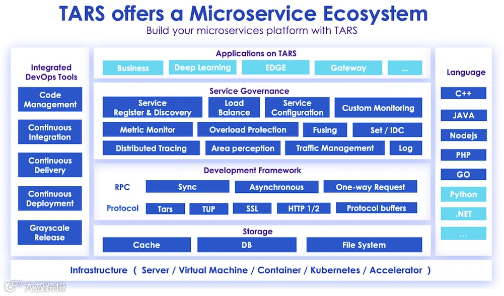 PaaS层:TARS作为Blueprint的微服务框架,可以提供高性能的RPC调用,支持在较大规模的横向扩展场景中高效部署微服务,并提供便捷的服务监控功能。