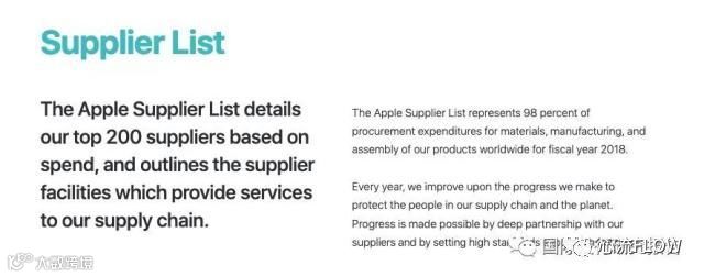 苹果每年都会发布供应商名单,苹果表示,这个名单占2018财年全球材料,制造和组装的98%的采购支出。