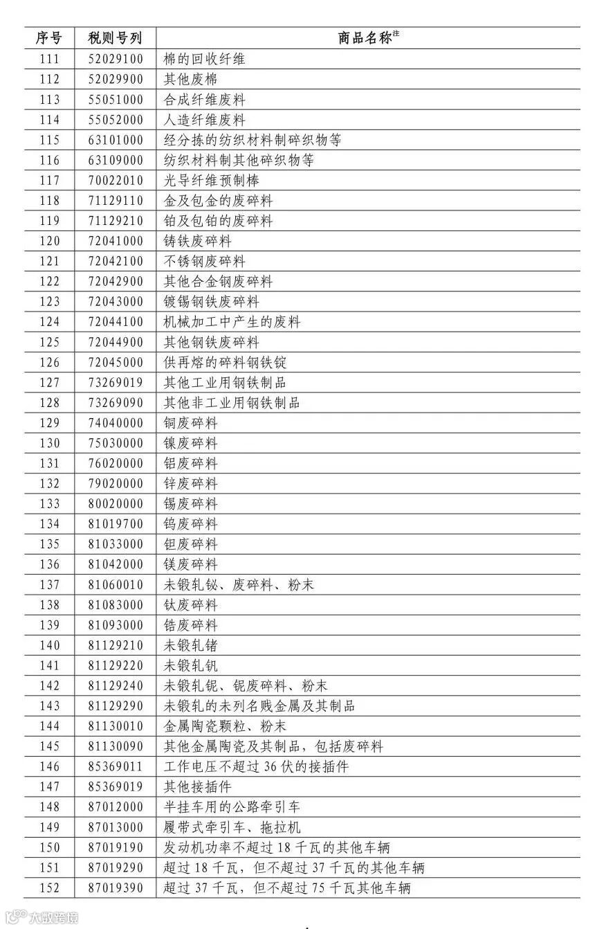 加征关税商品清单中涉及,光纤、光缆的原产料,光导纤维预制棒等产品,以及废钢铁、废油等多种进口废料。