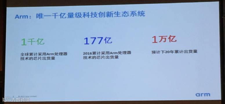截至当前,在全球范围累计采用Arm处理器技术的芯片出货量已达到1,000亿片,其中2016年累计采用Arm处理器技术的芯片出货量就有177亿片。他自信地预测,得益于IoT的巨大机遇,在下一个20年采用Arm处理器技术的芯片累计出货量将高达1万亿片!