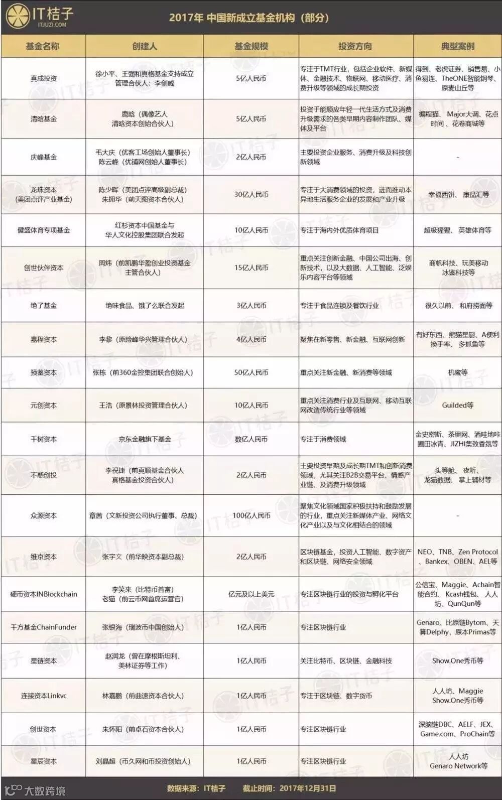 其中包括:大牌基金合伙人或骨干自立门户的新机构;CVC或投资机构成立的新基金;国家队、明星艺人、知名创业者发起的基金;以及9 家由比特币首富李笑来等人成立的专投区块链项目的基金机构。这9家基金在新机构中占比近20%,成为2017年新成立机构中的一大特色。