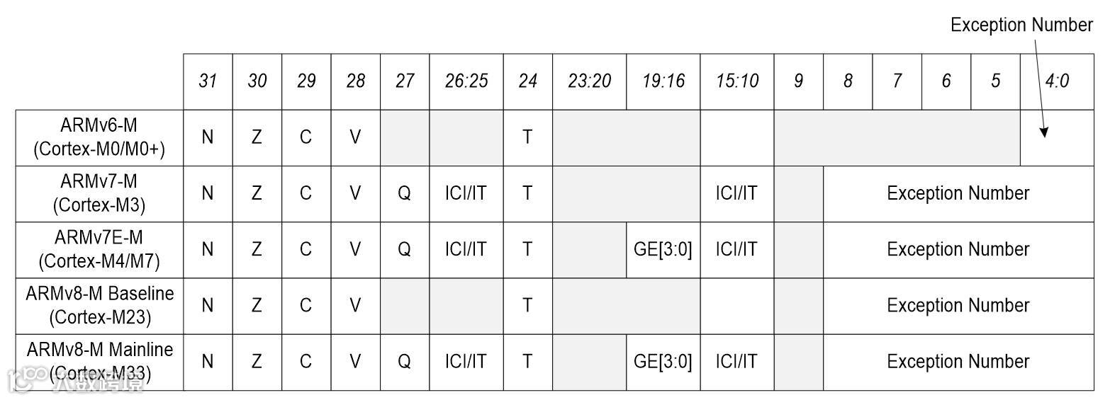 另外一个编程模型之间的不同是PSR寄存器(程序状态寄存器)的细节。所有的Cortex-M处理器,PSR寄存器都被再分成应用程序状态寄存器(APSR),执行程序状态寄存器(EPSR)和中断程序状态寄存器(IPSR)。 ARMv6-M 和 ARMv8-M Baseline系列的处理器不支持APSR的Q位和EPSR的ICI/IT位。ARMv7E-M系列 ( Cortex-M4, Cortex-M7) 和ARMv8-M Mainline (配置了DSP扩展的Cortex-M33 )支持GE位。另外,ARMv6-M系列处理器IPSR的中断号数字范围很小,如下图所示。