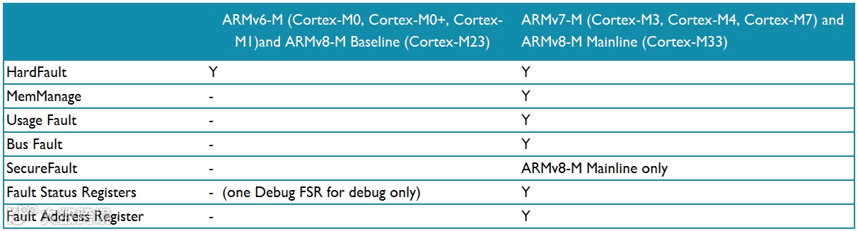 ARMv7-M 和 ARMv8-M Mainline产品除了HardFault还有几个可配置的错误异常: