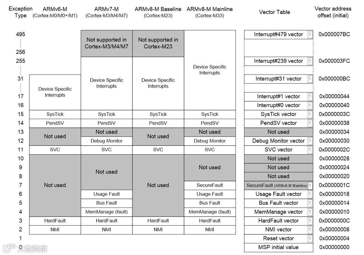 一些ARMv7-M/ARMv8-M Mainline系列的处理器使用的中断和系统异常并不被ARMv6-M/ARMv8-M Baseline的产品支持,如图8. 例如,Cortex-M0, M0+ 和M1的中断数被限制在32个以下,没有调试监测异常,错误异常也只限于HardFault(错误处理细节请参看章节3.4)。相比之下,Cortex-M23, Cortex-M3, Cortex-M4 和Cortex-M7处理器可以支持到多达240个外围设备中断。Cortex-M33支持最多480个中断。