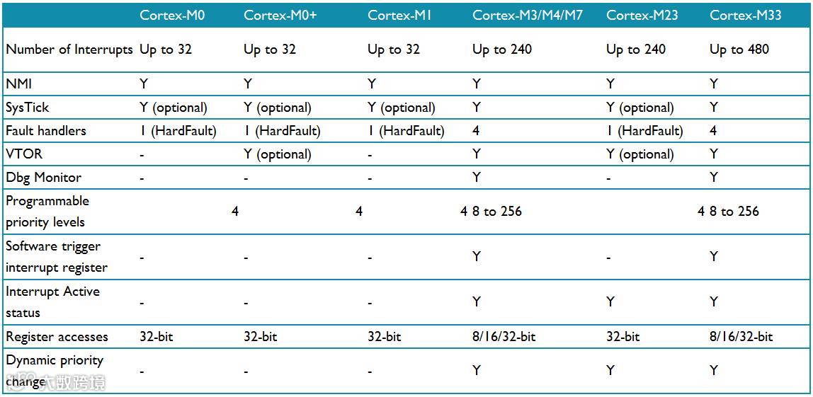 不同的Cortex-M处理器之间的NVIC编程模型也有额外的不同。差异点总结下表中: