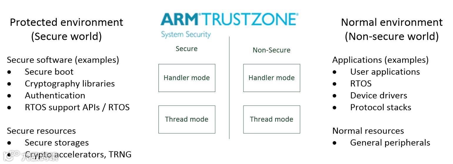 非安全状态的软件只能访问非安全状态的存储空间和外围设备,安全软件可以访问两种状态下的所有资源。