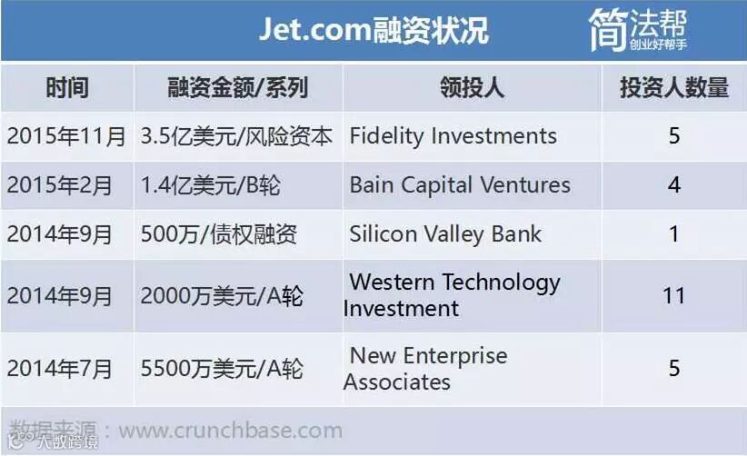 据媒体报道,截至收购前,Jet这家创业公司从包括阿里巴巴在内的19个投资方拿到四轮总额约5.65亿美金的融资: