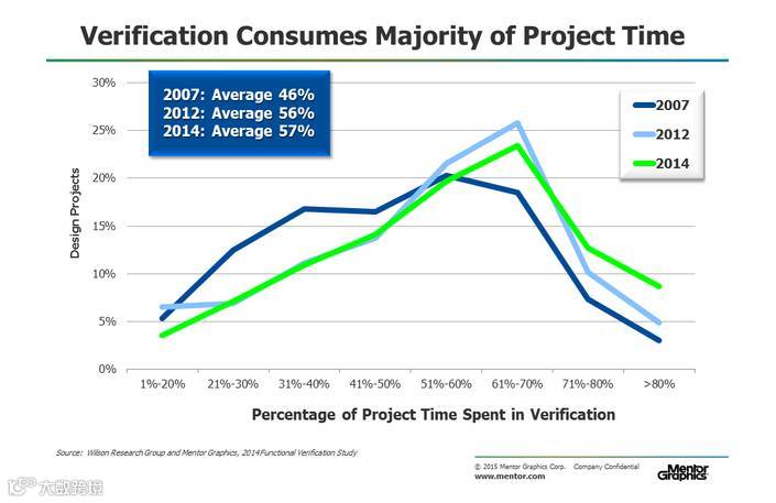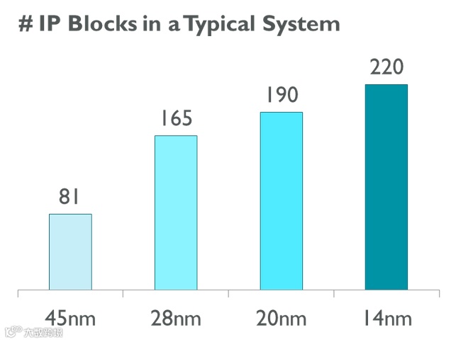 虽然付出了如此大的努力,但对于首次设计,功能故障的风险仍然普遍存在。自从多处理器芯片(包括异构设计)问世以来,SoC 的复杂度显著增加。在下图中,您可以看到随着时间推移以及工艺的演进 SoC 中的 IP 组件的数量迅猛增加。