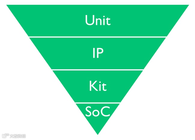 设计的验证工作在早期以单元粒度开始进行,这些单元共同构成了独立的 IP。在整个验证周期中,只有在单元级别上,工程师才能够获得对设计的最高可见性。除非信号太底层,否则我们可在单元级别上对各个信号进行探测,或将其设置为需要的值以协助验证。当单元级别的验证达到一定的成熟度之后,这些单元可以组合在一起,形成完整的 IP(例如一个 CPU)。在此之后,才能开始 IP 的 IP 级别验证。对于 CPU 而言,这通常是能够进行汇编程序级别测试的开始时间。此前,大多数测试只能通过控制各个线路/信号来进行。在 IP 级别上,测试是使用汇编语言编写的。处理器从内存(模拟)获取指令,对其进行解码,然后执行。在IP级验证到达一定的稳定性之后,多个 IP 组合形成一个系统,系统验证工作开始。