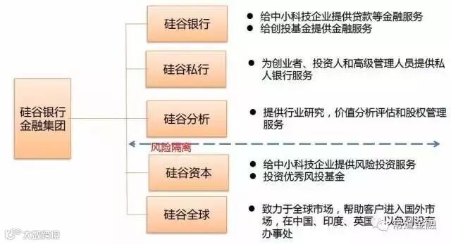 硅谷银行(SiliconValley Bank,简称SVB)成立于1983年,1987年在美国纳斯达克上市。专门为中小科技型创新企业提供综合金融服务,目前已发展成为金融集团架构,主要业务板块如下图: