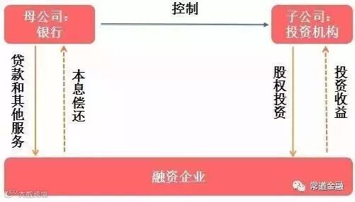 商业银行在境外设立股权投资机构后,向其推荐优质客户开展股权投资,根据客户不同发展阶段提供相应贷款和其他服务产品支持,提升本行综合化金融服务水平。在这种模式下,由于子公司属于银行集团内部机构,决策链条缩短,沟通成本降低,集团化综合经营优势明显。运作模式如下图: