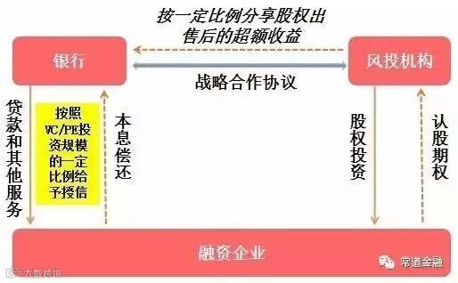 在上述投贷联动的基础上,银行为了分享股权投资背景下债权介入带来的超额回报,与合作的风险投资机构建立一种选择权(期权),即在贷款协议签订时,约定可以把贷款作价转换为对应比例的股权期权,当融资企业通过IPO、股权转让、或者被并购等方式实现股权溢价后,可由风险投资机构抛售所持的这部分股权,将收益分给银行,从而实现收益共享和分成。通过这样的方式,银行一方面规避了监管的限制但又同时分享了企业的股权回报,另一方面通过与创投机构一定程度上起到了 风险缓释的作用,相比于银行,创投机构在对于创业阶段企业的筛选上具有更强的专业能力,从而保证获得融资企业的质量。