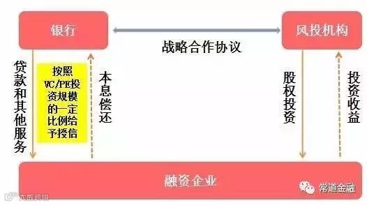 银行与风险投资机构合作初期,主要是以投贷联动模式为主,即银行根据自己的风险偏好,与部分股权投资机构签订战略合作协议,并跟踪和适度介入合作机构推荐的企业,建立与股权投资机构信息共享、风险共担机制,对于股权投资机构已投资进入的企业,给予一定比例的贷款及相关金融产品的支持,同时锁定被投资企业包括顾问服务、未来配套业务及资金结算等全面业务,实现股权与债权的结合。