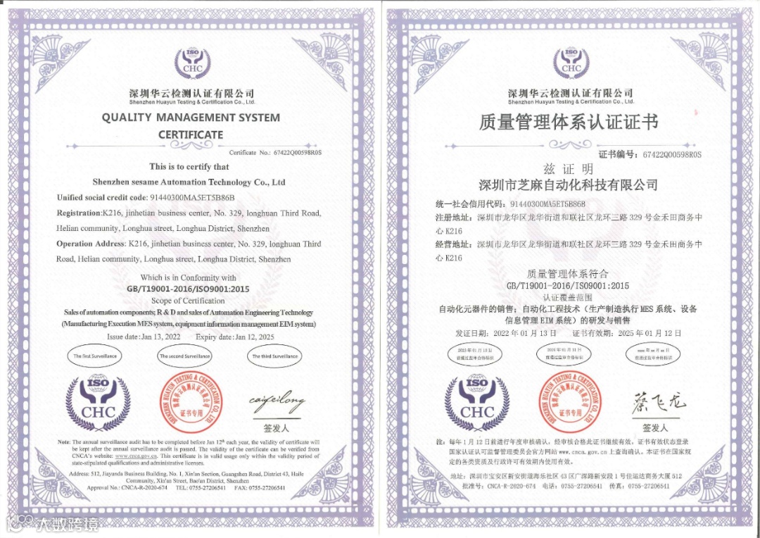 在全体员工的不懈努力下,经过认证公司评审专家组全面、严格、认真、客观的评审,深圳市芝麻自动化科技有限公司质量管理体系符合GB/T 19001-2016 idt ISO9001:2015标准要求,顺利通过认证审核。并于2022年1月13日,向我司正式颁发了ISO9001质量管理体系认证证书,成为了深圳芝麻一个重要的里程碑,凸显了深圳芝麻品牌的实力。