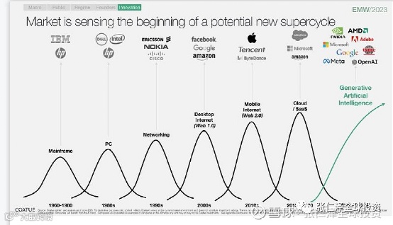 6,苹果的出现是因为4G,5G技术的成熟,电信底层硬件框架已经搭建起来了,才会有智能手机的出现和更新迭代。就像英伟达的GPU芯片技术成熟之后,才会出现自动驾驶,AI技术在日常生活场景中的应用。我们之下而上分析任何一家公司的时候,一定要考虑公司所处在的时代大背景。苹果走过了差不多十年大牛市,英伟达最近大热,这是不是信息时代的大周期。贴一张Coatue的研报图。