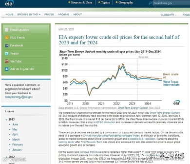5,巴菲特投资CVX 和 OXY,这些石油股是典型的周期股。这些石油股是和油价息息相关的,也就是油价只要没有大的跌幅,这些石油公司就变成了印钞机。OXY在2019,2020年都有巨额亏损,转而在2021,2022,2023年变成了印钞机。石油价格的预测太复杂,涉及到地域,政治和复杂的国际关系。贴一张EIA对未来油价的预测图。