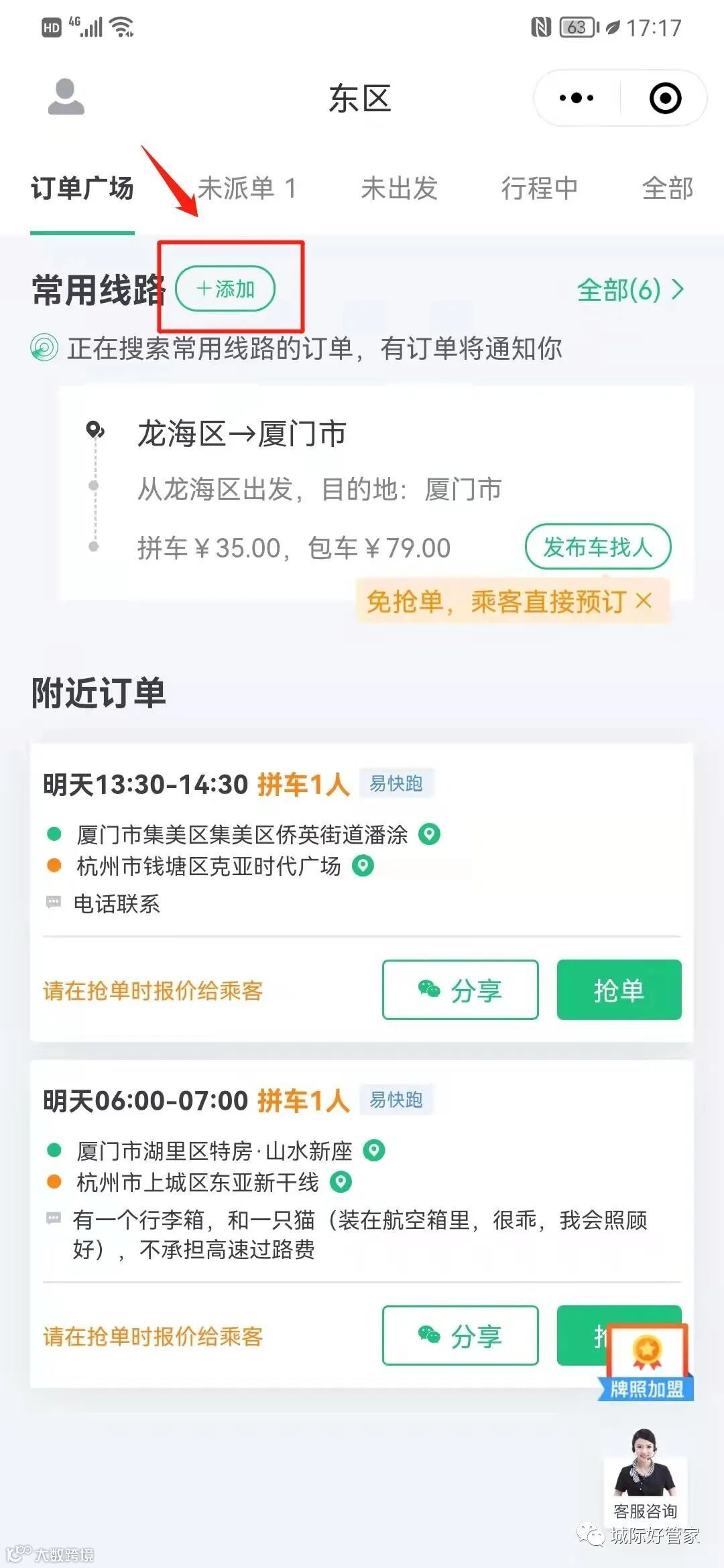 1.进入城际好管家小程序,点击订单广场常用线路旁的“添加”按钮;