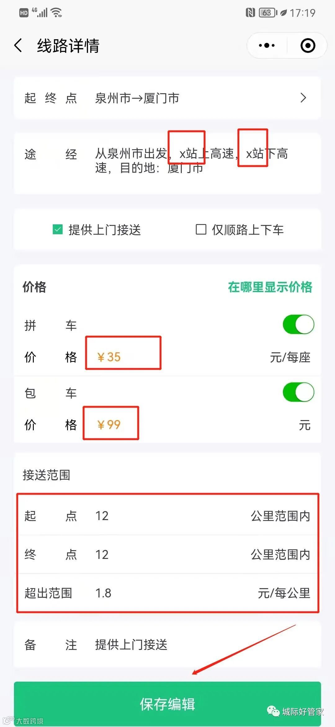 3.进入线路详情,如有走高速编辑好上下高速站点,没有的话可直接删除,设置好拼车和包车的价格以及接送范围的距离和超出报价,点击“保存编辑”,完成线路发布;