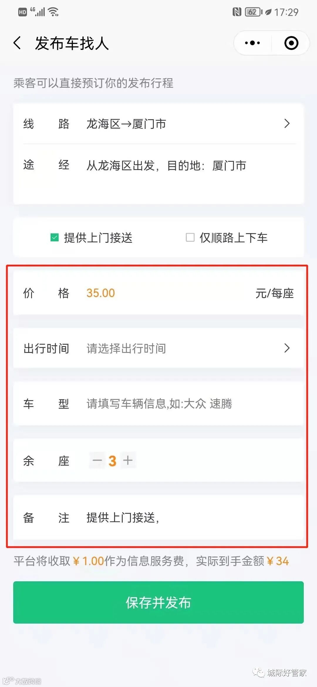 2. 进入发布车找人编辑页面,设置好价格、出行时间、车型和备注信息后点击保存并发布后完成编辑;