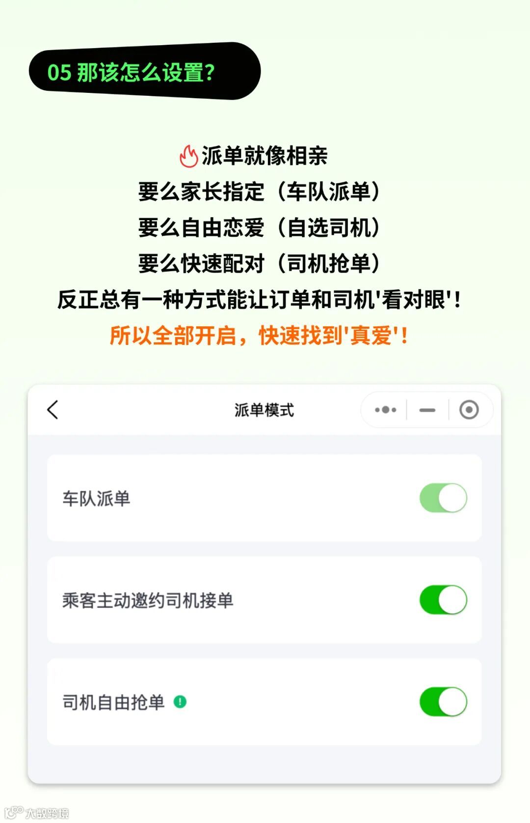 导读:派单就像相亲,要么家长指定(车队派单),要么自由恋爱(自选司机),要么快速配对(司机抢单),反正总有一种方式能让订单和司机看对眼!