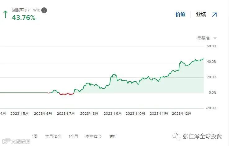我们以前国内的基金是通过中金CICC swap收益互换来进行美股投资的,美元的资金成本实在是太高了。年化差不多8%。这意味着我们即使什么也不做,每年的资金成本也要有8%,这个资金成本是很合理的,因为美元的利率很高。我们在2023年初关闭了国内的基金,转而在海外成立了美元基金。基金在2023年6月8日开始运作,截止到2023年12月31日的收益是43.76%,年化收益大概是77%。不过我觉得这个收益率并不是常态。我在前面的文章中也有提到,如果长期能做到年化收益20%,已经很OK了。