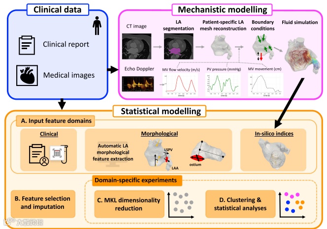 卒中,尤其是缺血性卒中,是全球范围内主要的致死原因之一。心房颤动(AF)是最常见的心律失常,也是缺血性卒中的重要风险因素。在AF患者中,血栓主要形成于左心房(LA),特别是左心耳(LAA)。传统评估工具(如CHA₂DS₂-VASc评分)主要依赖于临床和人口统计学因素,却忽视了左心房及左心耳的具体形态特征与内部血流动力学状态,这可能导致风险评估的偏差或不完整。尽管已有研究尝试通过计算流体动力学(CFD)等机理模型模拟LA血流,但这些研究多受限于样本量小、计算成本高,且很少将形态、血流与临床数据(如血液生物标志物)进行系统整合。此外,大多数机器学习方法采用监督学习,依赖于已标记的数据和人工特征工程,限制了其在探索潜在、未被标记的风险表型方面的应用。