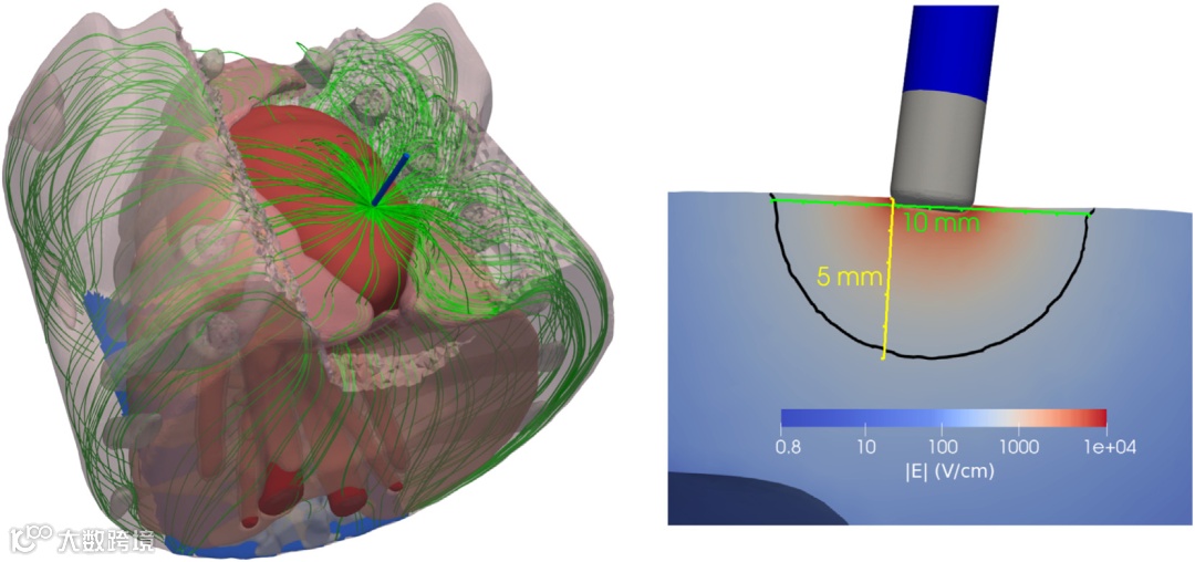 猪躯干内的模拟电场,沿着从有源电极到分散贴片的路径